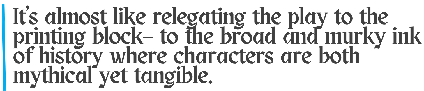 Macbeth is so nightmarish, the boundaries between sleep and wakefulness so fraught that it is a defining theme of the play. So the choice of such strong and even alienating lighting steeps the theatre of it all in something akin to sleep paralysis where demons lurk in the shadows and eyes are watchful in the gloaming. It’s almost like relegating the play to the printing block— to the broad and murky ink of history where characters are both mythical yet tangible.