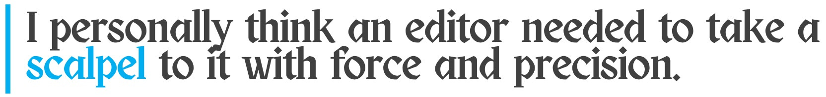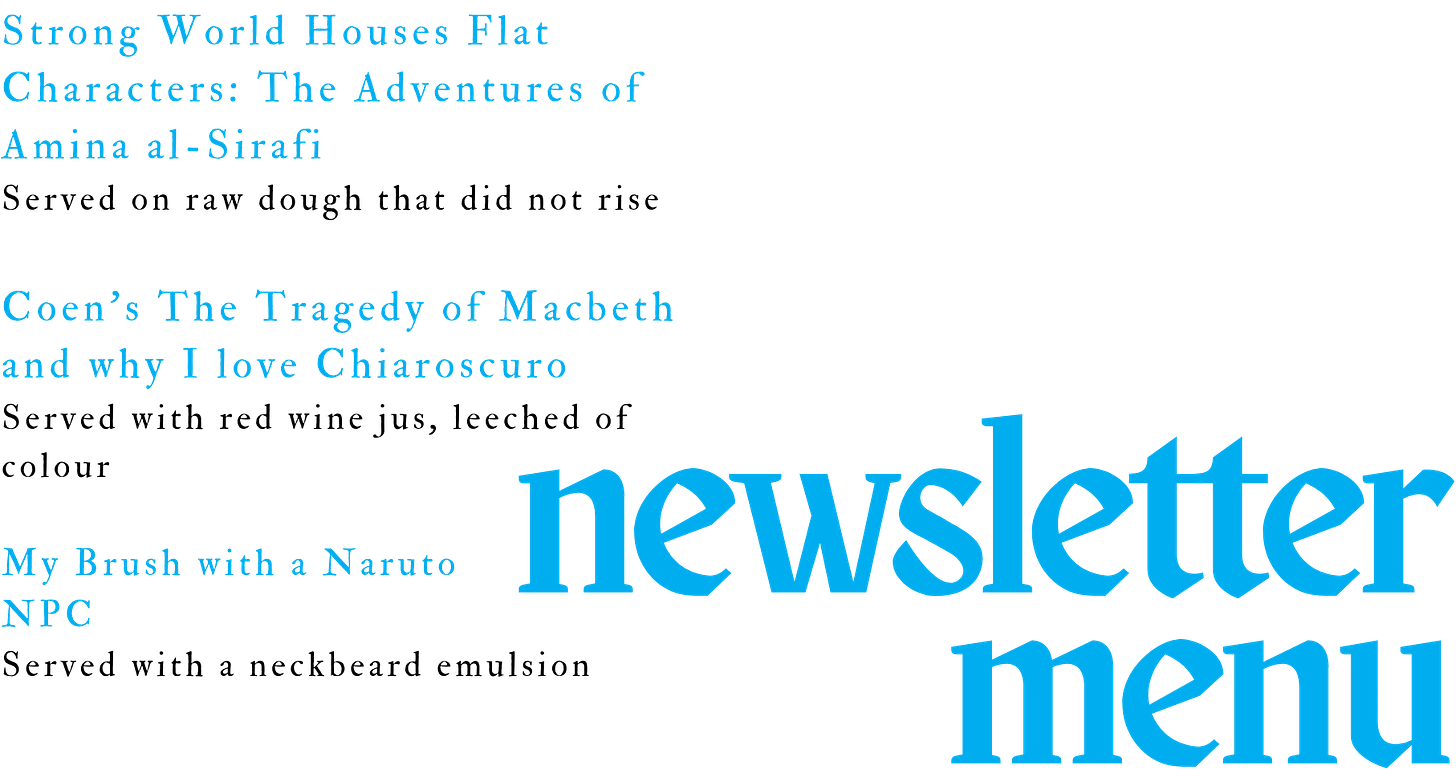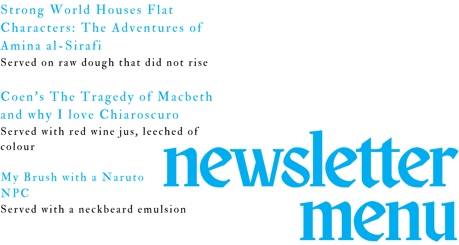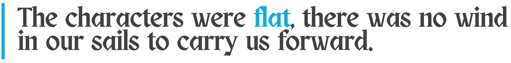 Example A isn’t actually bad. The statement of facts can be used with great creative effect. But if it’s all we are constantly fed without any Example B’s then it gets tiresome pretty quickly. I can only be told John Smith is a dickhead so many times before I begin to lose interest. And likewise we are told a million times that Amina is the world’s most fearsome pirate, how people quake in their boots; how she wins over sexist crews and earns their trust– but we never actually get to see any of it in action. I don’t believe the crew told her of their families, and likewise I don’t believe she missed her beloved ship, the Marawati. Where is her interaction with it? Worrying over it in a way that helps us feel we’ve got two feet planted on the deck?