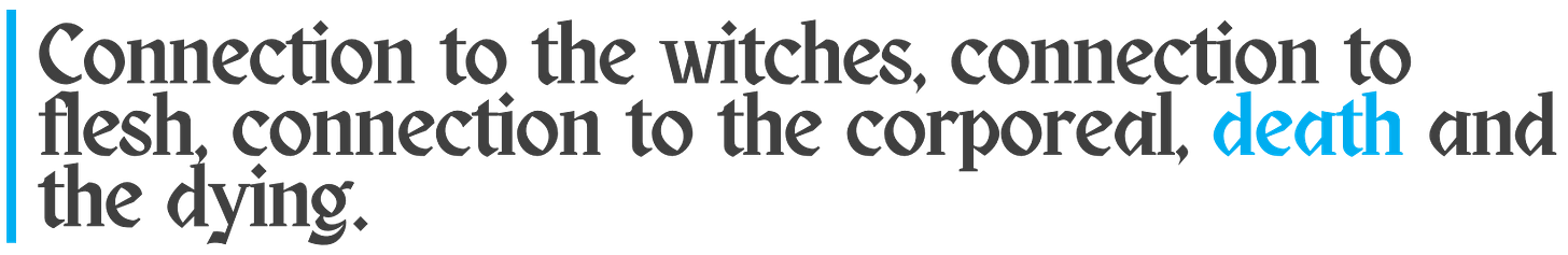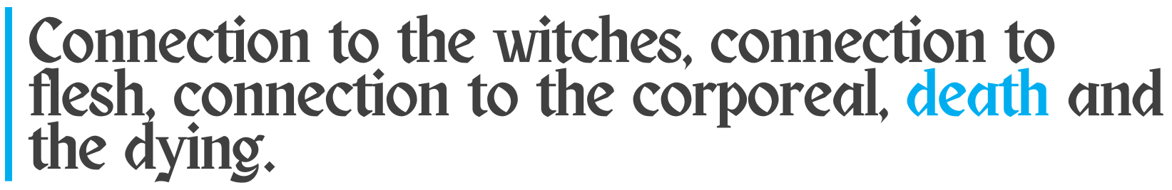 Never have I seen such a symbiotic relationship between performance and camera work. The use of the body to literally ‘embody’ her in the trio was electrifying, as was the twitching flightiness of the crow motif. Her performance felt heavily inspired by Lecoq and Laban; there was a leading with the wrists and the neck, a focus on joints as tissue and connection. Connection to the witches, connection to flesh, connection to the corporeal, death and the dying.