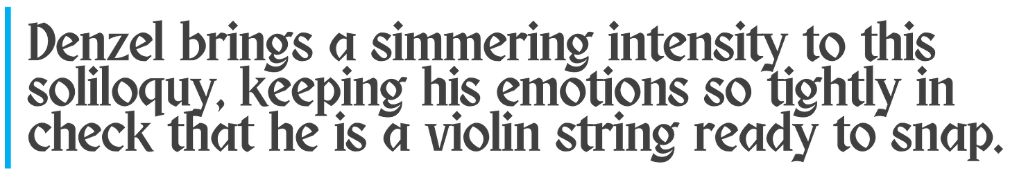 Denzel brings a simmering intensity to this soliloquy, even somewhat meditative, keeping his emotions so tightly in check that he is a violin string ready to snap. Frances rubbing her hands in the waters of a fountain sucks in air as she delivers her lines, eats them out of existence and terror.